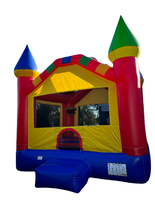 Our 12'x12' Castle Jump is good for all ages. Able to be set up inside or outside, requiring a 15' clearance. It features a safety net and bungee strap to prevent unintentional exits.