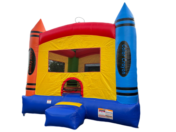 Our 12'x12' Crayon Jump is good for all ages. Able to be set up inside or outside, requiring a 15' clearance. It features a safety net and bungee strap to prevent unintentional exits.