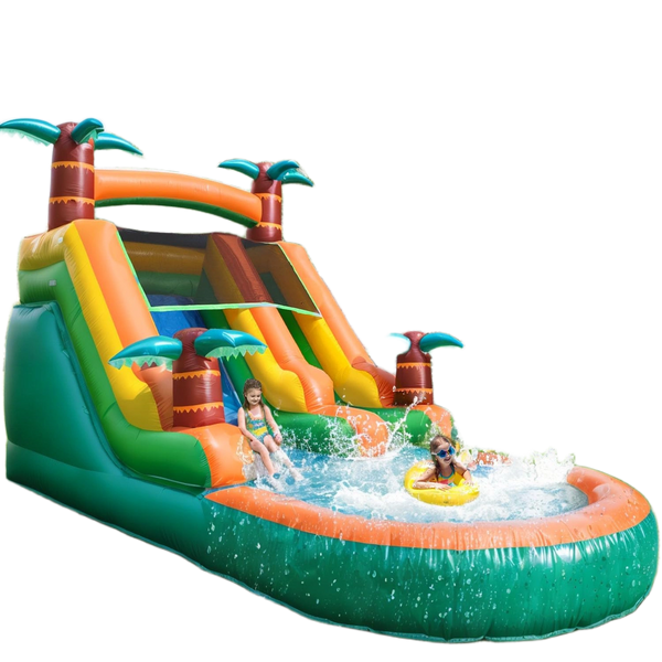 The Tropical Wet/Dry Slide is good for year round fun, capable of being a waterslide and pool, in the summer, and a dry slide in the winter. This can be set up inside, for dry occasions. It measures 12'x9'x18'.