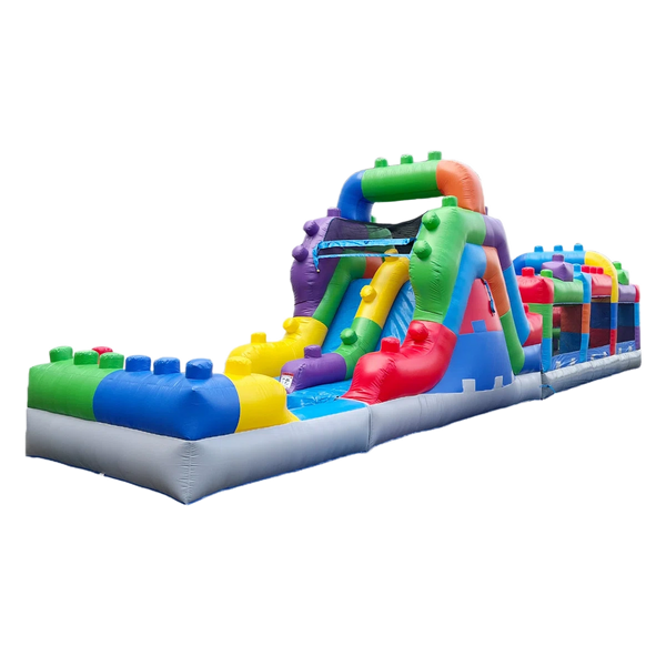 This 42 foot Obstacle Course / Slide can bring tons of fun for all ages! Standing 12ft tall and 8ft wide, this inflatable amusement can be set up outdoors and indoors, with enough space.