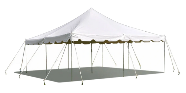 Durable, vinyl, pole tent measuring 20' x 20' can easily fit 36 people comfortably, seated at tables. Need tables and chairs? We also have the tables and chairs to complete your party needs.